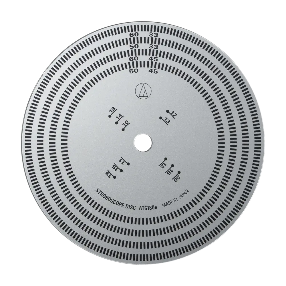 El disco estroboscópico AT6180a de Audio-Technica es una herramienta de calibración esencial para verificar y ajustar la velocidad de rotación de tu tocadiscos. Compatible con velocidades de 33-1/3 y 45 rpm, funciona bajo iluminación fluorescente estándar de 50 o 60 Hz. Incluye una guía integrada para calibrar el overhang (saliente de la cápsula) sin necesidad de herramientas adicionales. Diseñado para audiófilos, técnicos de instalación y profesionales del vinilo que exigen precisión en sus equipos de reproducción.