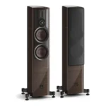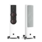 El recinto curvado en MDF con refuerzos internos y el frontal de aluminio inyectado aportan rigidez y control de vibraciones. Los pies de aluminio son ajustables para nivelar y desacoplar del suelo, y las rejillas frontales magnéticas permiten proteger los drivers sin fijaciones visibles. Mide 380 × 1120 × 420 mm y está disponible en High Gloss Black, Walnut, Maroon (Chestnut Brown) y White. El peso es 40,5 kg por pareja.