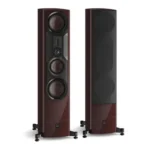 El recinto curvado, pesado y rígido (64 kg por unidad), emplea lacado alto brillo con chapa de madera real, disponible en Black, Maroon y Walnut. Las paredes curvas ayudan a reducir ondas internas y resonancias, lo que limpia la respuesta en medios. La inercia del conjunto limita vibraciones del mueble y mejora la definición de los graves. Sus dimensiones (422 × 1.310 × 554 mm) requieren una base estable y algo de planificación en la sala.