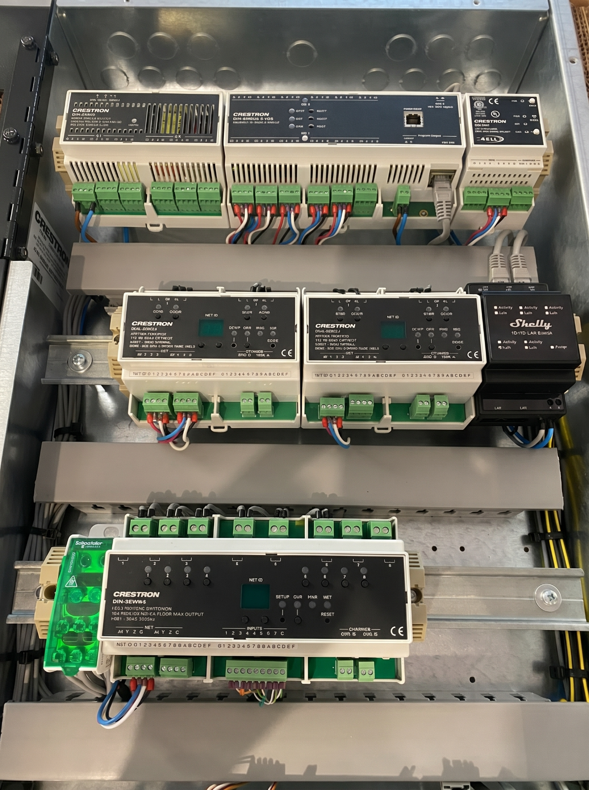 Nuestra labor se centró en unificar bajo Crestron Home todos los sistemas instalados por diferentes proveedores (iluminación DALI, motores de persianas, cortinas y toldos). Para que toda esta infraestructura fuera viable sin haber tenido una previsión previa en planos, la inteligencia del sistema se distribuyó en 9 cuadros de domótica repartidos por la vivienda, aprovechando la instalación ejecutada por la empresa eléctrica.